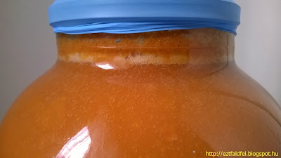 Ha megvagyunk a leszűréssel, akkor valószínűleg nagyjából négy liter körüli szép sárgabarackszínű erjedésben lévő musthoz jutottunk hozzá. Ennek egy részét langyosítsuk fel, majd keverjük el benne az első adag (60 dkg) kristálycukrot és a citromsavat vagy borkősavat. Amikor ez is megvan, az egészet öntsük egy ötliteres befőttes üvegbe. Akinek nem indult be a vödörben az erjedés, vagy kihagyta az előerjesztési folyamatot, és friss gyümölcsből préselte a mustot, az adhat hozzá porított élesztőt a folyamat biztos beindításához. Ha így tennénk, akkor vegyünk ki a cukrozott mustból három decinyit, langyosítsuk fel, és adjuk hozzá az élesztőt. Tegyük félre tíz percre, hogy az élesztő dolgozhasson, majd amikor már kellően habzik, öntsük az üvegbe. De ismétlem: akinek az előerjesztés sikeres volt, és habzó, jellegzetes illatú cefrét készített, kihagyhatja az élesztőzést nyugodtan. Mi kihagytuk, és anélkül kezdtük meg a zárt erjesztést (2014.07.10-én).Néhány megjegyzés: sokan kérdezik, miért kell hozzá cukor, miért ennyi, és miért több részletben. A gyümölcsborokból kinyert musthoz mindig adnak cukrot, mert általában a gyümölcsök nem tartalmaznak annyi cukrot, amennyi a legalább 11% alkoholtartalmú bor erjesztéséhez szükséges. Ha pedig a végtermék nem éri el legalább a 11% alkoholtartalmat, akkor nem lesz huzamosabb ideig eltartható. Azonban ha édes bort szeretnénk készíteni, akkor még magasabb, akár 13-15% alkoholtartalom is szükséges lehet a megfelelő íz elérésének érdekében, ugyanis az édes borokban kevésbé érződik az alkoholos íz. A cukrot pedig azért kell több részletben a borhoz adni, mert ha ekkora mennyiséget egyszerre adunk hozzá, akkor olyan mértéket öltene a cukorszint, hogy az már gátolná az élesztőgombák szaporodását. Ezért két részletben cukrozunk, és a második részletet akkor adjuk csak hozzá, amikor az első adag már kierjedt belőle.Ezután a kis kitérő után folytassuk, ahol abbahagytuk: kezdjük el a zárt erjesztést. Zárjuk le az ötliteres üveget borászati kotyogóval, vagy a blogunkban már ismertetett, azt helyettesítő házi módszerrel. Ha borászati kotyogót fogunk használni, akkor az üveg ne legyen tele, csak maximum 3/4 részig, mert nem lesz elég hely a forrás közbeni habzásnak. Ha a házi módszert használjuk, akkor nyakig tölthetjük az üveget, mert a gumikesztyűben lesz elég hely a folyamatoknak (ezért is szeretjük mi ezt jobban). Akit érdekel a házi kotyogót helyettesítő módszer, az nézze meg az erről készült leírásunkat, mert nem kívánjuk minden borunk alatt újra és újra leírni ugyanazt.Az erjedés először elég intenzív, majd pár nap elteltével alább hagy, és szépen elcsendesedik. Amikor azt látjuk, hogy már alig pezseg, érdemes egy ízpróbát tartani (nálunk ez 2014.07.16-án történt meg). Ha úgy érezzük, hogy most már szájízünknek megfelelő, akkor befejeződött az erjesztési folyamat. Ilyenkor leginkább száraz-félszáraz jellegű a bor. Aki a csemegebort szereti, annak most jön az utánacukrozás. Ehhez vegyünk ki a léből nagyjából egy edénybe egy liternyit, egy másikba pedig fél liternyit. Az egy litert langyosítsuk fel, majd adjunk hozzá 70 dkg kristálycukrot. Kevergessük addig, amíg teljesen el nem olvad benne a cukor, majd öntsük vissza az üvegbe. És most fogjuk látni, hogy miért vettünk ki két adag lét. (fél liter) léből öntsünk vissza annyit, hogy ismét nyakig legyen az üveg, ami megmaradt, azt pedig fogyasszuk el egészséggel. :-) Ha visszaöntöttük, akkor zárjuk le ismét kotyogóval az üveget, és tegyük vissza oda, ahol eddig volt. Kis idő múltával a friss tápanyagnak (cukor) köszönhetően újra beindul az erjedés (mi az utánacukrozást 2014.06.25-én végeztük el).