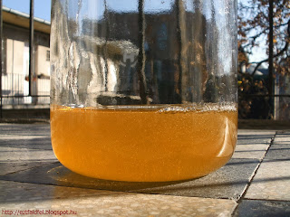 A mézet keverjük össze a fellangyosított(maximum 30 fok) vízzel és a citromsavval - vagy borkősavval - (ez nálunk 2013.12.01-én történt meg). Az eredeti recept azt írta, hogy a méz és víz elegyét forraljuk fel, majd két órányi forralás alatt többször is szedjük le róla a képződő habot. Erre az eredeti recept szerint azért van szükség, hogy megakadályozzuk a vadélesztők bejutását (valahol azt is olvastam, hogy ettől tisztább, átlátszóbb lesz a végeredmény). Egy baj van csak ezzel: ha a mézet felforraljuk, akkor elvész belőle minden, amitől a méz annyira értékes kincs, és csak egy finom ízű - de egyébként hasztalan - édes szirup marad belőle. Ezért én úgy döntöttem, hogy vállalok minden következményt, és nem fogom a mézet felforralni (mint utóbb kiderült, ez jó ötlet volt). A vadélesztők miatt a hozzáadott élesztő okán nem aggódtam. A működési mechanizmus ugyanis az, hogy ha egy élettérben több faj számára is megfelelőek az életkörülmények, akkor igen nagy a valószínűsége, hogy az a faj fog elszaporodni, majd egyeduralkodóvá válni a többi fajt kiszorítva, amelyiknek elsöprő többséggel nagyobb az egyedszáma. A levegő, a csapvíz bizonyosan nem csírátlan, de egy légmentesen lezárt üvegben egészen biztos, hogy a hozzáadott élesztőfaj lesz egyedei lesznek túlnyomó többségben, így minden más fajt ki fognak szorítani. Feltételezésem be is jött, de erről majd később.